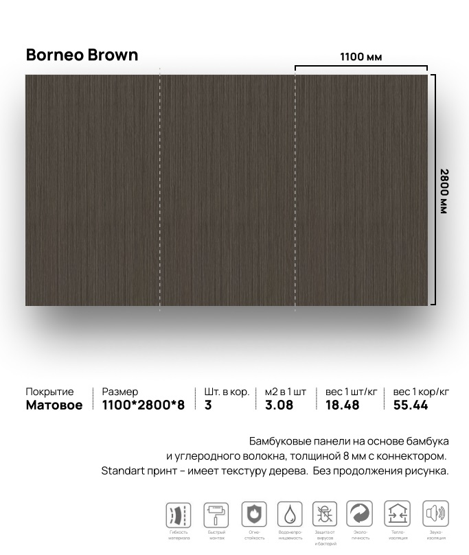 1 вариант дизайна Размеры: 1100 мм × 2800 мм × 8 мм Производство: Китай Материал: композиционный на основе бамбука с добавлением углеродного волокна (карбона) Тип поверхности: матовая Основные цвета: коричневый Применение: для отделки внутри помещений, для стен, для потолков