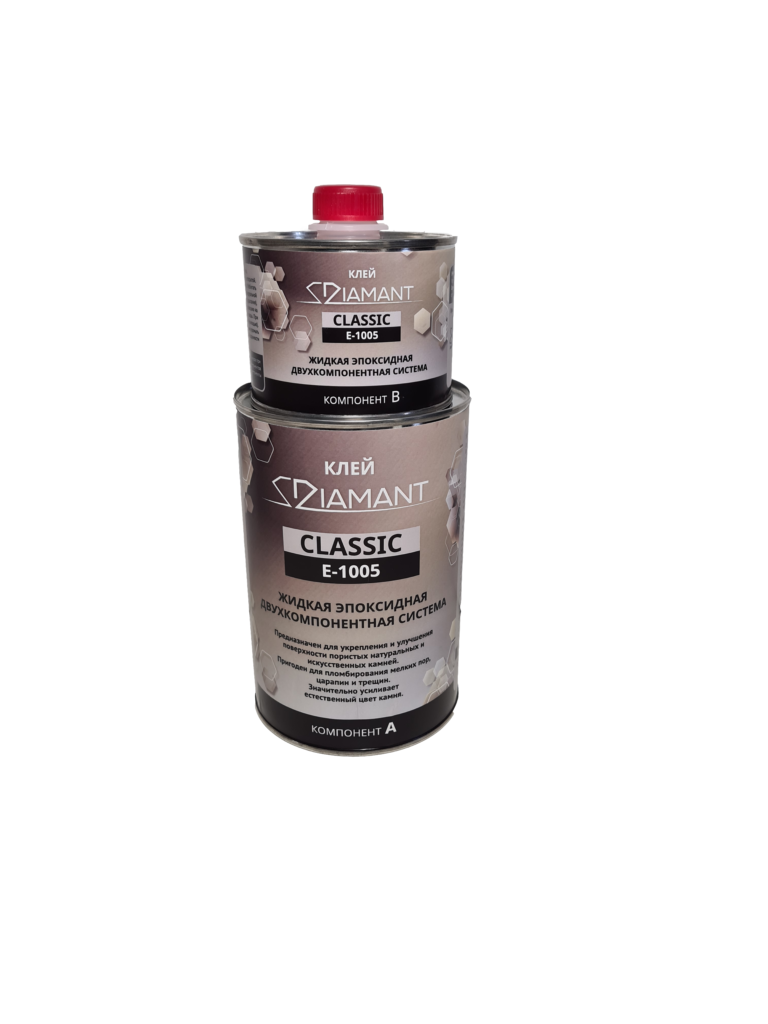 Описание: Клей Diamant Classic E-1005 – очень жидкая эпоксидная двухкомпонентная система, на основе эпоксидных смол с модифицированным полиаминным отвердителем. УПАКОВКА: Компонент А — жестяная банка 1,0 кг, Компонент B- жестяная банка 0,25 кг. Область применения: Клей Diamant Classic E-1005 предназначен для надежной пломбировки трещин и крупных пор натуральных и искусственных камней, известняка, бетонных блоков. Значительно усиливает естественный цвет камня. Для пломбирования мелких пор, царапин и трещин рекомендуется использовать клей Diamant Premier E-1016. Характеристики: очень жидкая консистенция, имеет высокую степень проницаемости не содержит растворителей отностительно быстро отверждается пригоден для светлых натуральных камней очень хорошо полируется и шлифуется значительно усиливает цвета поверхности увеличивает твердость и улучшает качество поверхности камня низкая тенденция к пожелтению со слабым запахом Свойства: Цвет: прозрачный, палевый Потребление: прим. 100-200 г/м2 Время отверждения на плитах предварительно подогретых: 20°C — 24 часа 30°C — 12 часов 40°C — 6 часов 50°C — 4 часа 60°C — 3 часа Вышеуказанная информация основана на данных технического развития последнего периода. Поскольку способы и средства применения вне нашего контроля, производитель не является ответственным за правильность применения материала.