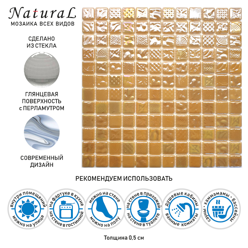 Продажа осуществляется кратно 1шт, минимальный заказ - 1 шт. Мозаика на сетке. Рекомендуется использовать клей для мозаики. В упаковке 20 шт. Внутри помещений и на улице, на кухне, на стене и на полу. Подходит для бассейнов, хаммамов, саун,ванная комната, для душевой.