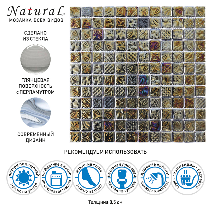 Продажа осуществляется кратно 1шт, минимальный заказ - 1 шт. Мозаика на сетке. Рекомендуется использовать клей для мозаики. В упаковке 20 шт. Внутри помещений и на улице, на кухне, на стене и на полу. Подходит для бассейнов, хаммамов, саун,ванная комната, для душевой.
