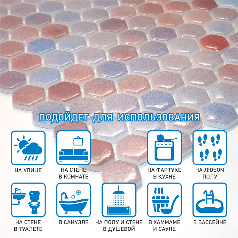 Продажа осуществляется кратно 1шт, минимальный заказ - 1 шт. Мозаика на сетке. Рекомендуется использовать клей для мозаики. В упаковке 20 шт. Внутри помещений и на улице, на кухне, на стене и на полу. Подходит для бассейнов, хаммамов, саун,ванная комната, для душевой.